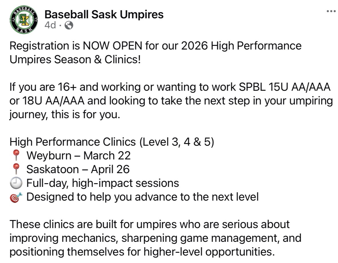 For more information please check out the Baseball Sask Website to register, Sask Five clinic is now available to register.